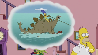 The dinosaur that marge is riding up there is one of the Stegosauria. The Stegosaurus is the one most people think of, but in reality, there were several species. One of the things they all had in common, though, was the spiked protrusions at the end of their tails. This spiked protrusion has a name. It's called the Thagomizer.